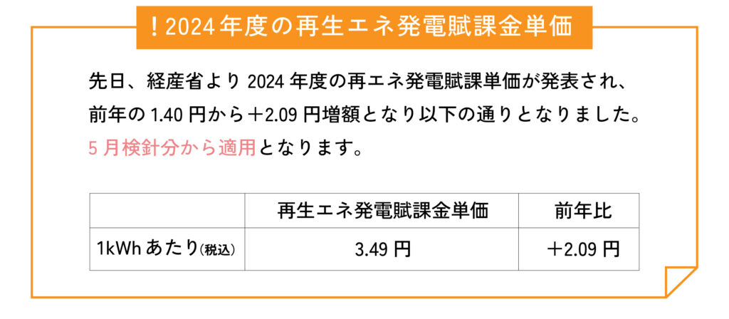 - 2024年度の再エネ発電賦課金単価は3.49円に、5月検針分から適応されます。