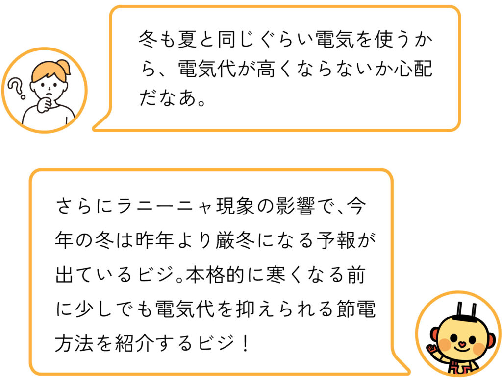 冬は気温が低いことから、エアコンやヒーター、こたつなどの暖房器具の使用が増えることも大きな理由のひとつです。また暖房器具は、比較的消費電力が大きいものが多いため、使用時間が長くなると比例して毎月の電気代も高くなります。