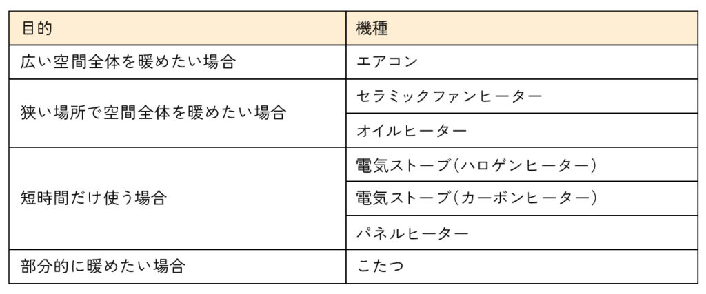 - 暖房器具はそれぞれ得意な暖め方があり、性能を理解して使うことで電気代を抑えることができる