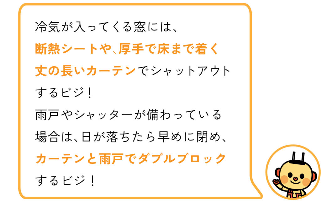 - 暖めた空気を外に逃がさないために、窓に断熱シートを張ったり床に着く長さのカーテンに取り換えて空気の逃げ道を作らない