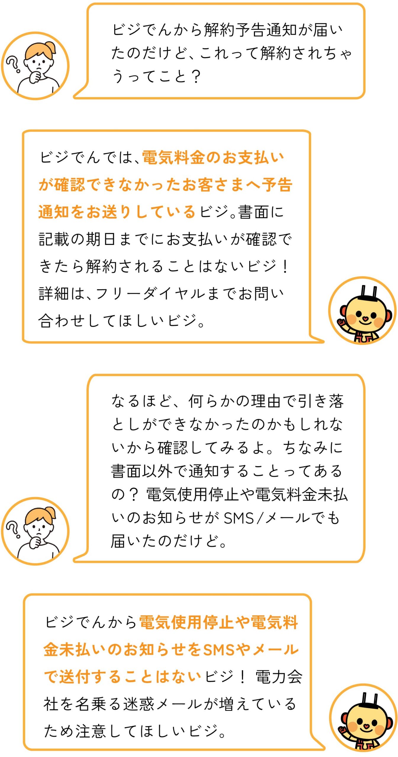 - 電気料金のお支払いが確認できなかったお客さまへ予告通知をお送りしており、書面に記載の期日までにお支払いが確認できれば解約されることはない