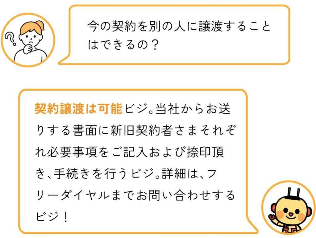 - 契約譲渡する場合は、当社からお送りする書面に新旧契約者さまそれぞれ必要事項をご記入および捺印頂く手続きが必要