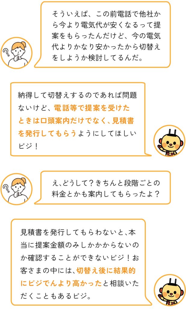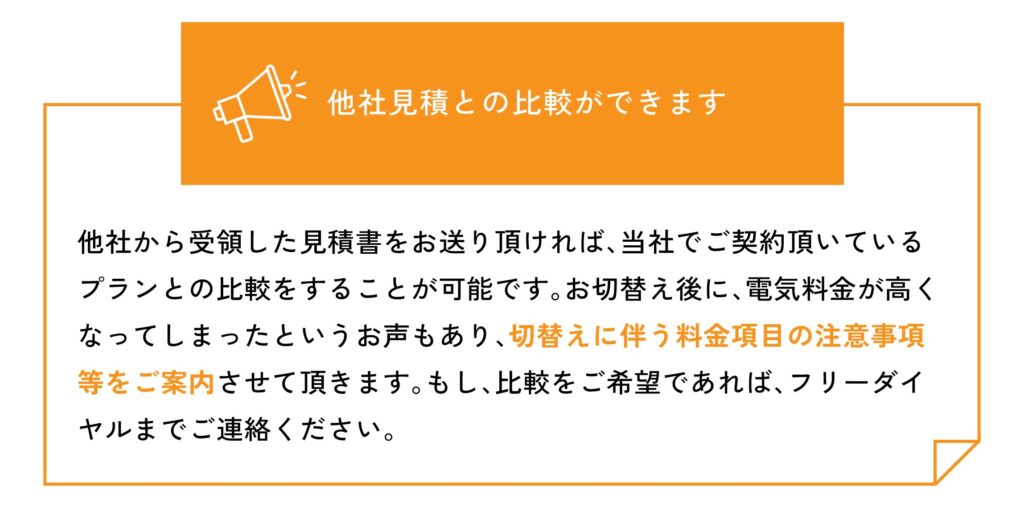 お電話等で提案を受けた際は、見積書を発行頂くことをおすすめします。他社の中には、お電話で提案を受けた金額の他に、実際は電源調達調整費などの市場連動料金や、容量拠出金相当額の負担料金などがかかるといった料金体系だったということがあります。また、現在ご契約のプランとの比較が上手くできていない場合もあるため、他社から提案を受けた場合は当社までご相談ください。