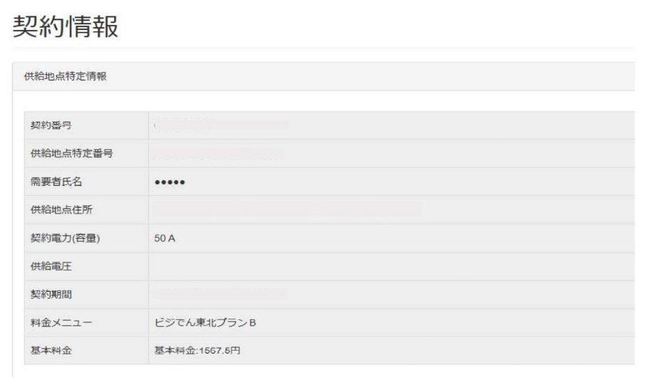 マイページにログイン後、メニューバー「契約情報」→需要場所情報からご契約アンペア数を確認することができます。