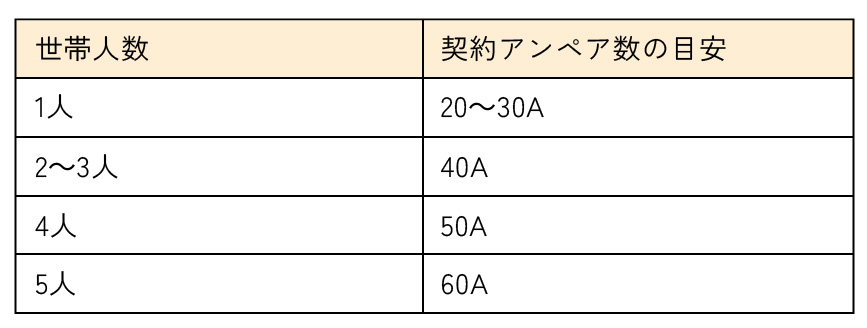 同じ世帯人数でも、「リモートワークで家にいる時間が長い」「日中は誰も家にいない」など、ライフスタイルによって適正な契約アンペア数は異なるため、あくまでも目安程度として捉えましょう。
